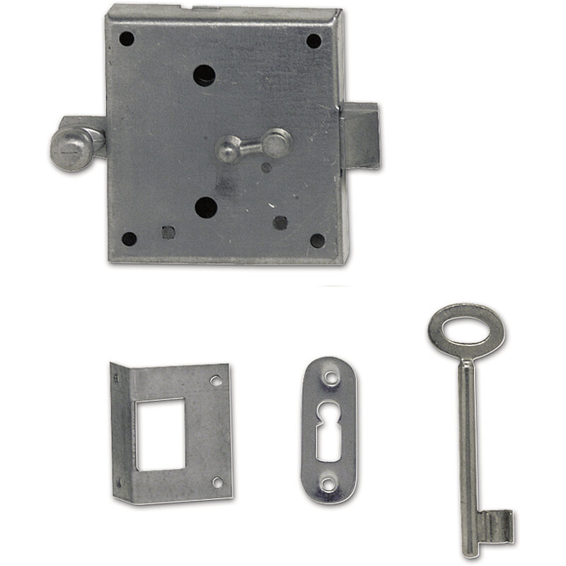 Lieferumfang: Sperrhebel, Winkelschließblech, 1 Schlüsselrosette und 2 Schlüssel.
