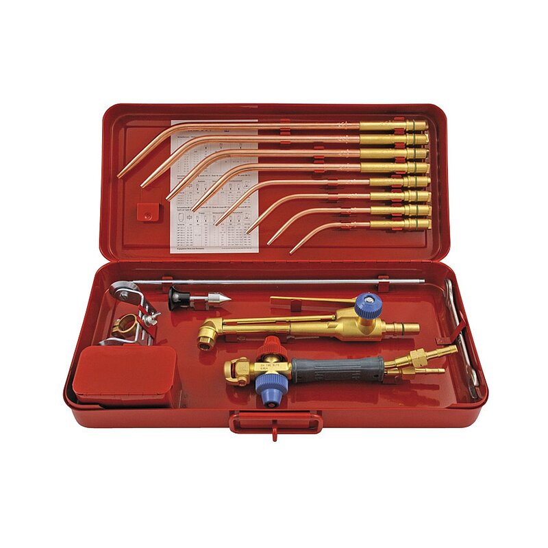 Bestückt mit wahlweise 6 oder 8 Schweißeinsätzen. Alle Teile sind in einer robusten Stahlblechkassette aufbewahrt.