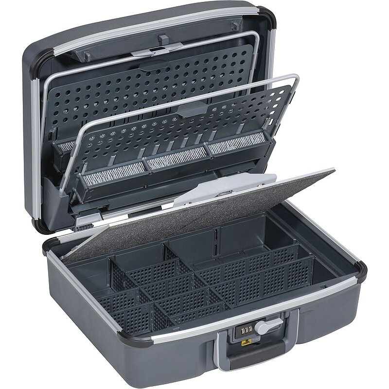 Service- und Montagekoffer in attraktivem Kofferdesign und einem Aluminiumrahmen mit stabilen Stoßecken. Innovative Deckelbremse mit Einrast- und Bremsfunktion, Zahlenschloss,Einhandzentralverschluss. Ergonomischer Zwei-Komponenten Griff. Ausstattung: Zwei Werkzeugträger mit Bürstenhalter sowie Gummischlaufen und Textilschlaufen, Trennstege in Schwalbenschwanzführung.