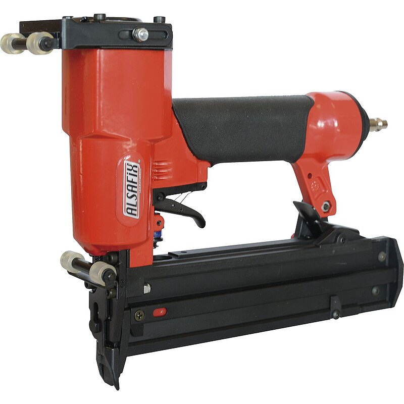 Spezialgerät für die verdeckte Befestigung von Glasleisten, gummierte Rollen erlauben ein sicheres Annähern zur Glasleiste, der speziell geformte Sicherheitstaster krümmt den Stauchkopfnagel und weist ihn von der Glasscheibe ab, verstellbarer Winkel des Gerätes zur Glasoberfläche, werkzeugloser Magazinschnellverschluss, Unterladermagazin für schnelles Nachladen, Kontaktauslösung, gummierter Handgriff.