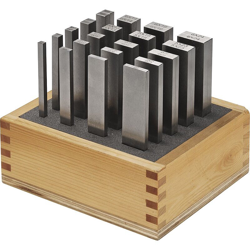 Im Holzständer. Paarweise planparallel feingeschliffen. Größenangaben stirnseitig auf dem Produkt. Sätze ergeben einen großen Bereich mit 1 mm - Stufung. Einsatzgehärtet. Paartoleranz tp in der Höhe IT 5.