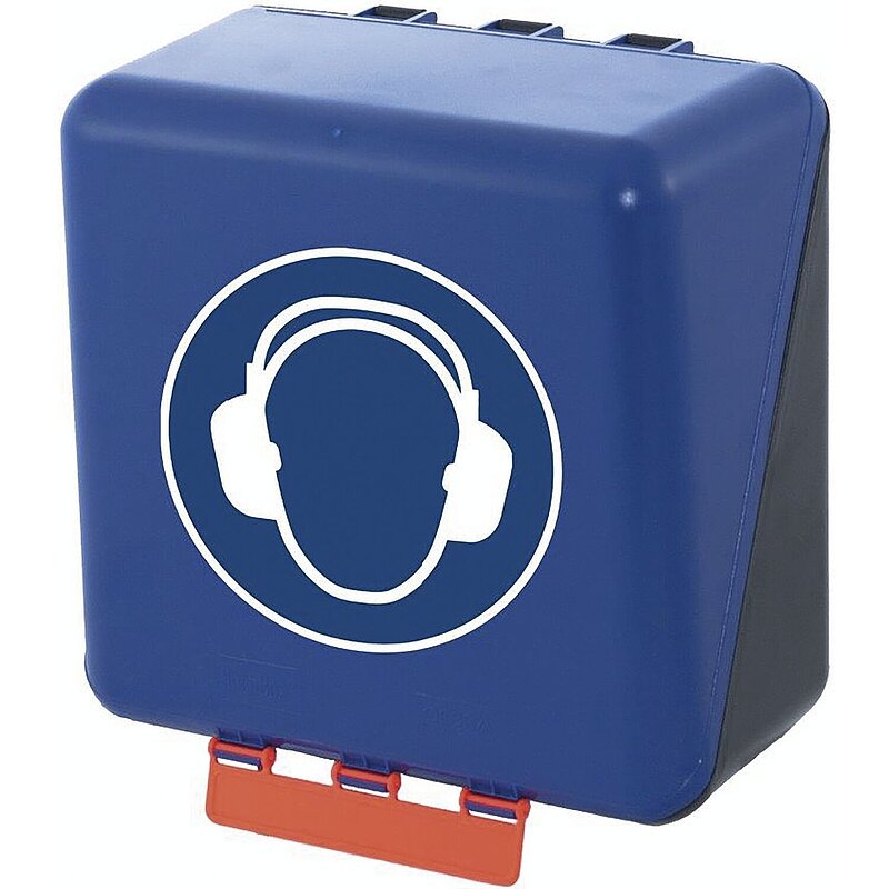 Behälter aus ABS-Kunststoff zur sicheren und sauberen Aufbewahrung der Gehörschutzartikel. Mit Gebotszeichen und patentierter Kippöffnung zur schnellen und einfachen Entnahme.