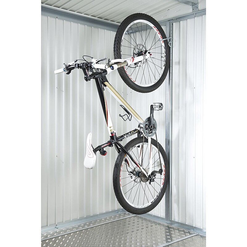 Mit der Fahrradaufhängung bikeMax können Sie Ihre Fahrräder bis zu einer Größe von 26-Zoll platzsparend in Ihrem Biohort Metall Geräte Haus aufbewahren. Im Geräteschrank können Sie aufgrund der Bauhöhe maximal Kinderfahrräder bis 24 Zoll aufbewahren. Der Aufhängehaken ist zudem 6-fach höhenverstellbar. Überdies ist eine Absperröse für Fahrradschlösser bereits integriert. Maße B x T x H (cm): 4 x 4 x 173