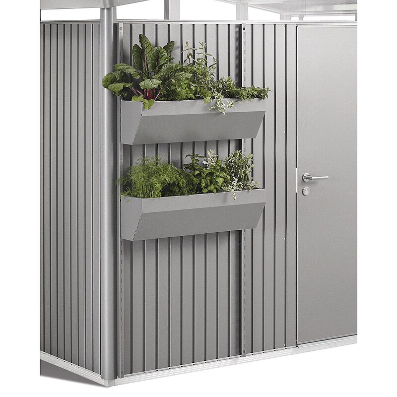 Zwei Steher (Höhe 1880 mm) werden in der Farbe des Gerätehauses an der Außenwand angeschraubt und die Blumenkästen in beliebiger Höhe eingehängt. Kunststoffeinsätze, zur einfacheren Bepflanzung, werden standardmäßig mitgeliefert.