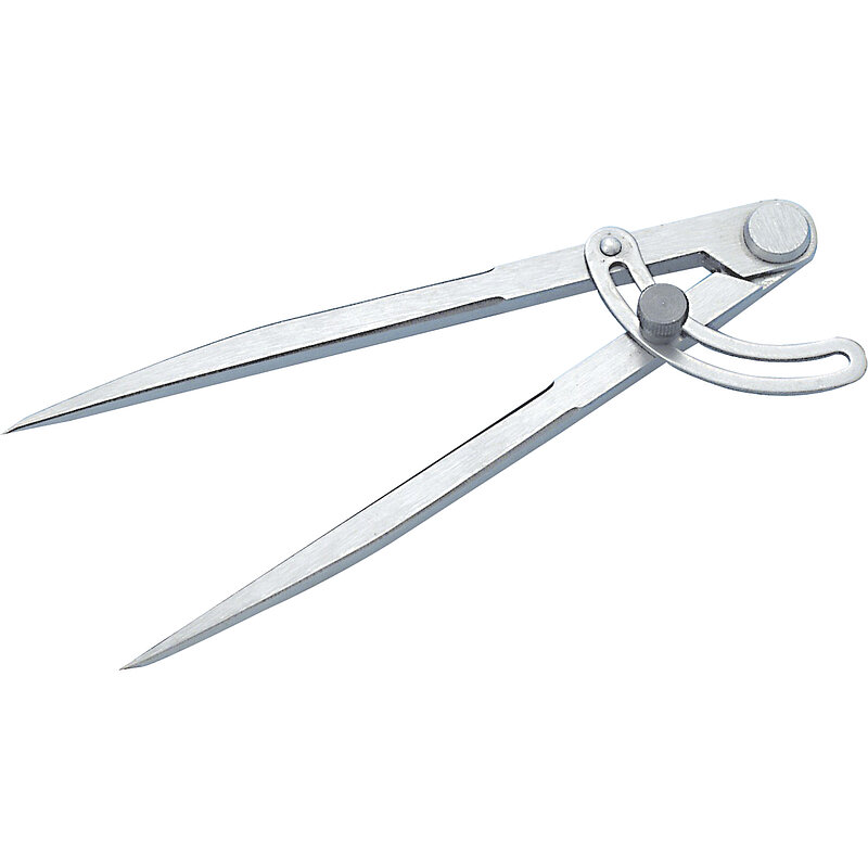 Mit Stellbogen und Klemmschraube, aus Stahl, geschmiedet, mit 3-teilig gefrästem Gewerbe, geschliffen und poliert, Schenkel achtkantig geschliffen. Spitzen gehärtet und geschliffen. Mit extra starkem Nietscharnier.