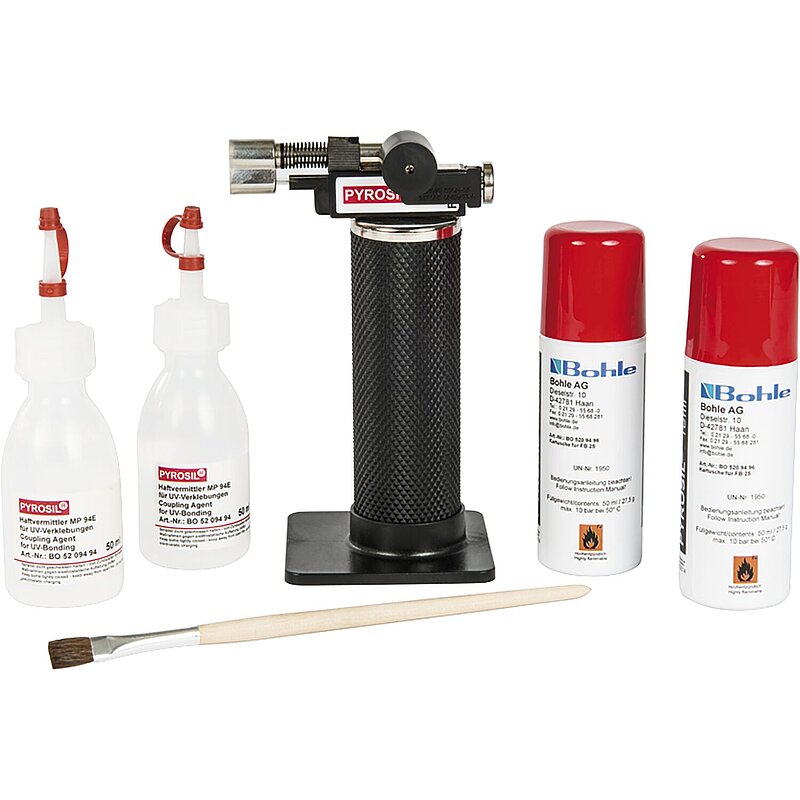 Bohle Pyrosil® ist eine Spezial-Gasmischung zur Aktivierung der Oberflächen. In Verbindung mit dem mitgelieferten Pyrosil Primer wird ein optimaler Materialverbund erzielt. Die Verbindung wird durch den Einsatz dieses Systems vor Unterwanderung von Feuchtigkeit geschützt. Die Anhaftung des Klebstoffes wird stark verbessert. Durch das Verfahren wird mit Hilfe einer Brennerflamme ein Silikatsinter auf die Substratoberfläche aufgebracht. In einem zweiten Arbeitsschritt wird ein Haftvermittler aufgetragen, der mit dem Silikatsinter reagiert und bei der anschliessenden Verklebung eine feste chemische Verbindung mit dem Klebstoff eingeht. Eine so durchgeführte Verklebung ist langfristig vor Unterwanderung von Feuchtigkeit geschützt.