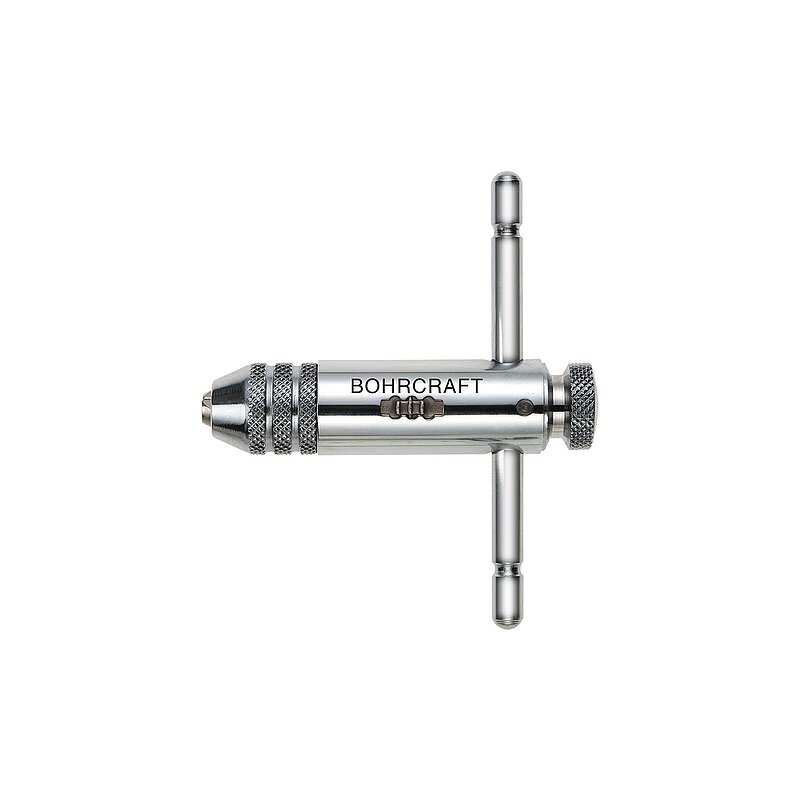 Links- und Rechtslauf einstellbar, Quergriff verschiebbar. Mit Zweibacken Spannfutter zum Spannen von Vierkantschäften. Ideal zur Verwendung an schwer zugänglichen Stellen.