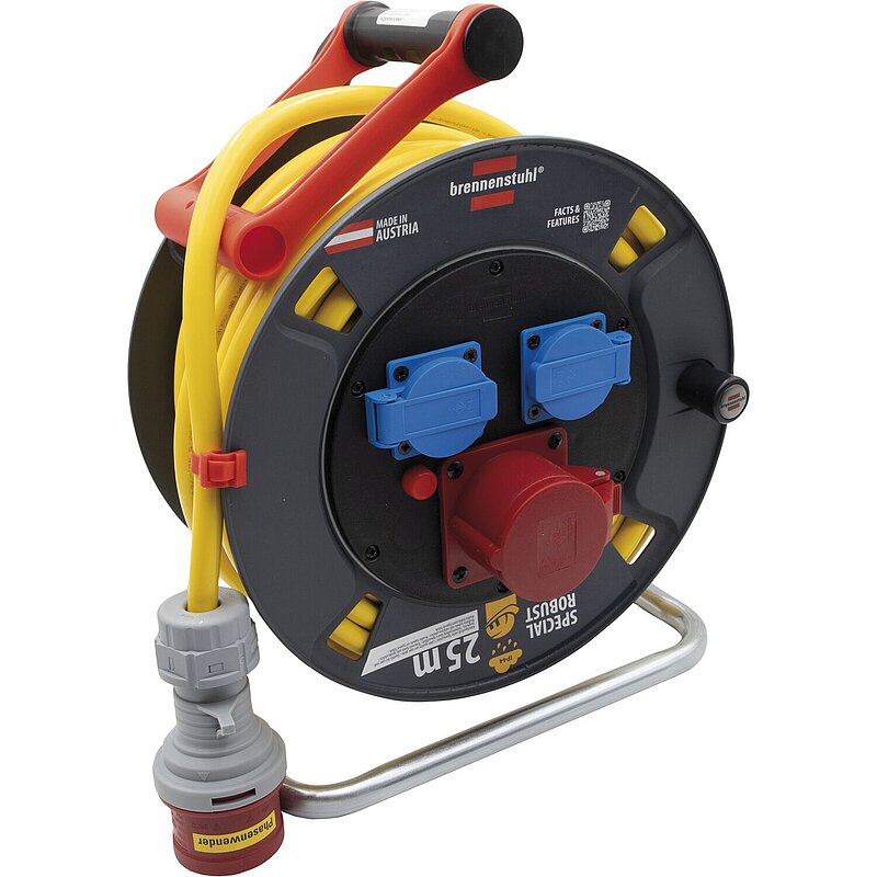 Trommelkörper aus Spezialkunststoff auf einem verzinkten Tragegestell. Innovativer Tragegriff „Cablepilot“ für eine perfekte Kabelführung. Pendelt auf beiden Seiten und ermöglicht bequemes Tragen sowie einfaches Aufhängen. Mit Drehgriff für komfortables Aufrollen. Mit Trommelbremse. Mit ölbeständigem, mechanisch hochbelastbarem und bis -35 °C kältebeständigem BREMAXX®-Spezialkabel in gelber Signalfarbe – ideal für den professionellen Einsatz im Freien. Überhitzungsschutz mit Kontrollleuchte zur Anzeige von Überhitzung und Überlastung.