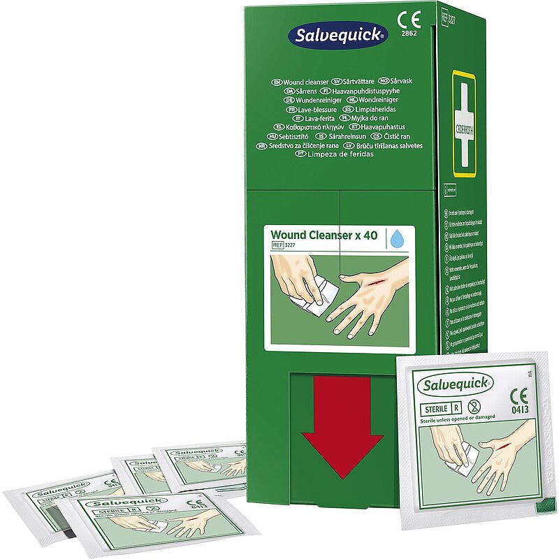 Salvequick Wundreiniger ersetzt Watte und flüssigen Wundreiniger aus der Flasche. Leicht und bequem in der Anwendung. Gut geschützt in der Verpackung. Die Wundreinigungs-Flüssigkeit besteht aus steriler physiologischer Kochsalzlösung.