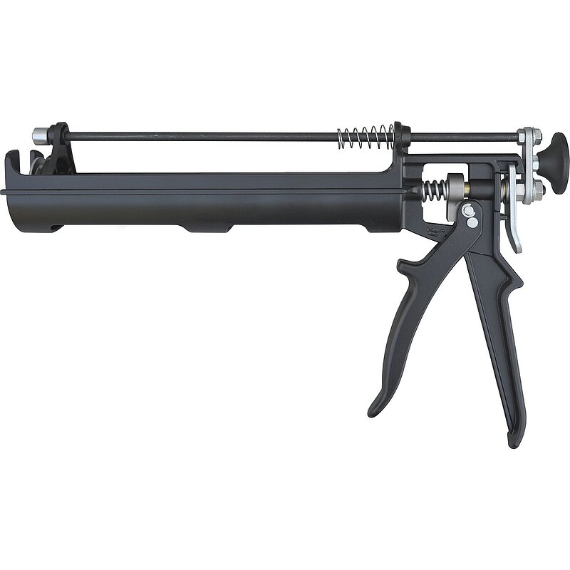 Stabile Auspresspistole aus Metall: Gewichteinsparung durch Einsatz von Magnesium. Reduzierter Kraftaufwand durch verbesserte Übersetzung von 1:25 erleichtert das Auspressen. Geeignet für Side-by-side Kartuschen mit 345 ml Inhalt oder Standardkartuschen mit 165 ml, 280 ml, 300 ml. Die obere Schubstange dient als Zeiger.