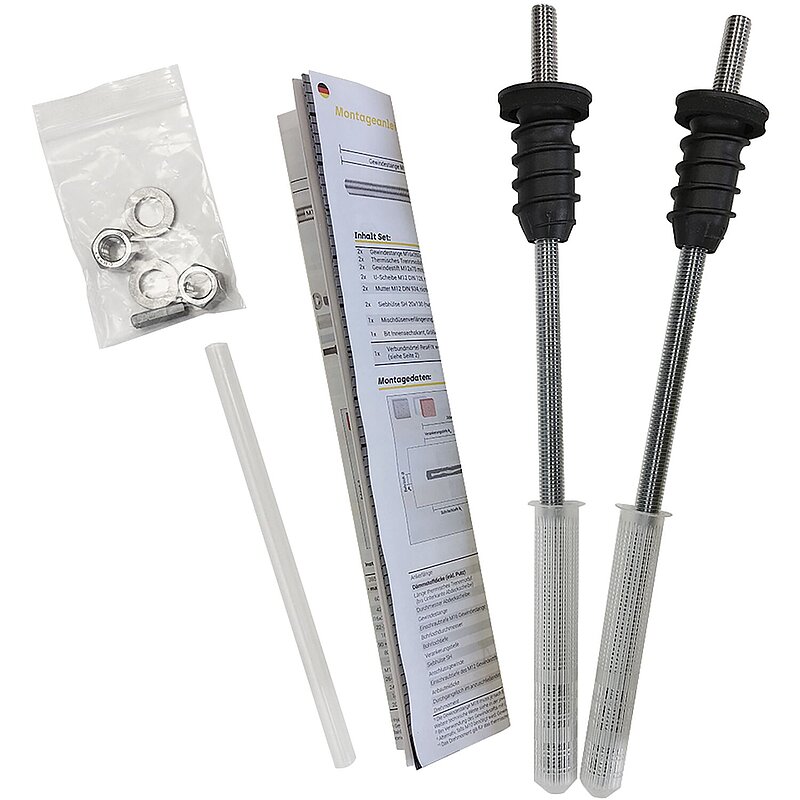 Artikelset (vormontiert) bestehend aus: 2x ResiTHERM® 12, thermisches Trennmodul M12 / M12, 2x Gewindestange M12x260, DIN 976, nichtrostender Stahl A4, 2x Gewindestift M12x70, DIN 913, A4, 2x Sechskant-Mutter M12, DIN 934, A4, 2x Unterlegscheibe für M12, DIN 125, A4, 1x Innensechskant-Bit, Größe 6, 1x Mischdüsenverlängerung 245 mm, 2x Kunststoff-Siebhülse SH 20x130 mm, 1x Montageanleitung ResiTHERM® 12.