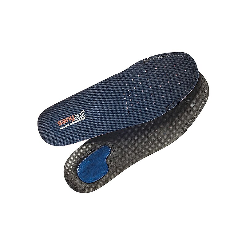 Antistatisches Fußbett mit Geleinsatz im Fersenbereich, Oberfläche aus Sany-Dry®, absorbiert im Kontakt mit der Haut den Schweiß im ganzen Fußbereich und unterstützt die Atmungsaktivität. Hygiene und antibakterieller Schutz garantiert durch Bayer®.