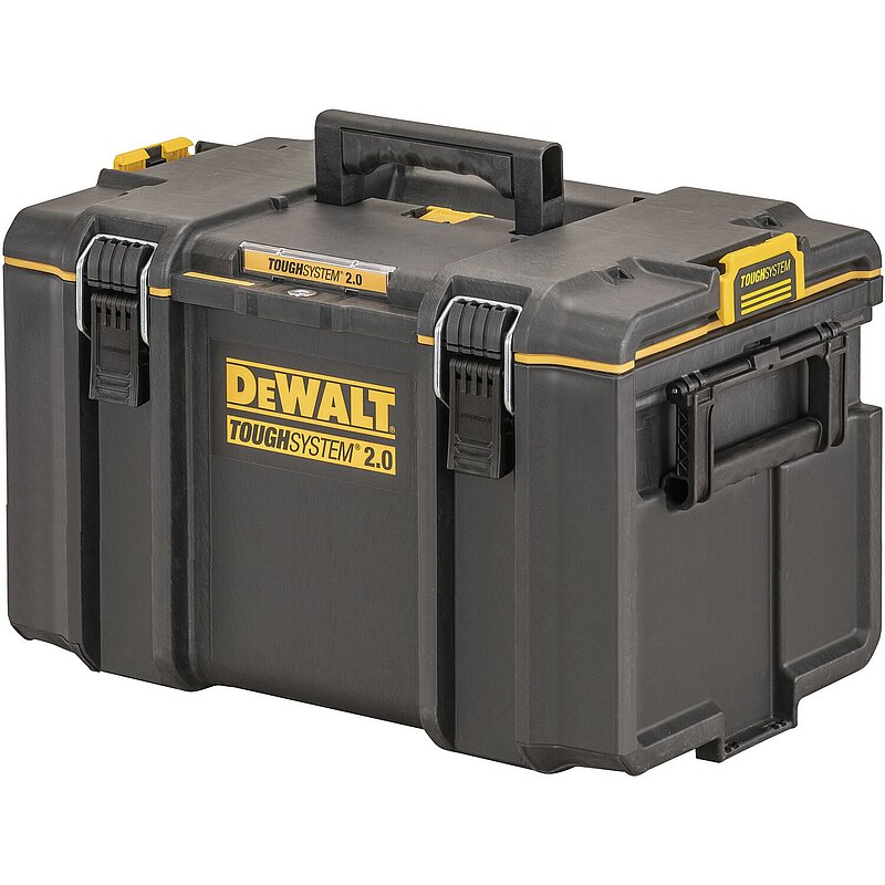 Die neue Generation ToughSystem 2.0 mit IP65 Schutz (staubdicht / spritzwassergeschützt). Kompatibel mit ToughSystem 1.0. Boxen stapelbar und miteinander verriegelbar mit noch robusteren Riegeln und Verschlüssen. Noch breitere und stärkere Bügelgriffe aus Bi-Material und 12% größeres Innenvolumen. Möglichkeit, den DEWALT Tracker zu installieren und die Box per DEWALT Tool Connect App zu orten. Fach für Namensschild.
