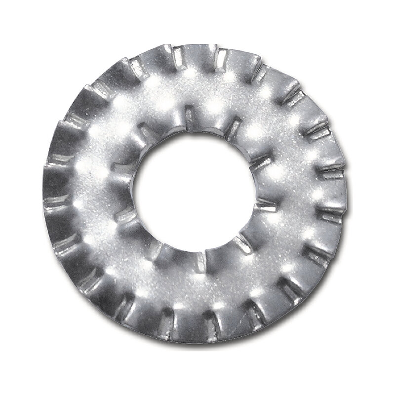 Fächerscheiben mit Doppelverzahnung, geeignet für Anwendungen bei denen der Innenlochdurchmesser wesentlich größer als der Schraubendurchmesser ist, bzw. bei Langlöchern.