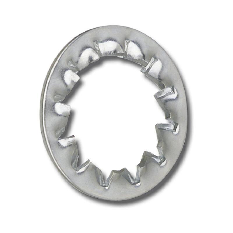 Scheibe mit überlappter Innenverzahnung, geeignet für Befestigungen mit beschränkten Anziehmomenten. Im Vergleich zu der Aussenzahnscheibe ist diese Scheibe für nicht ebene Auflageflächen geeignet.