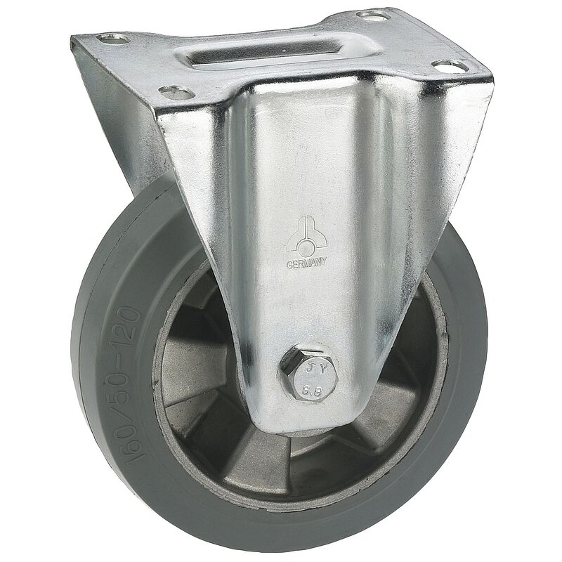 Wabenfelge aus Aluminium-Druckguss mit grauem (bei Ø 250 mm mit schwarzem) Elastik-Vollgummireifen und Kugellager im Drehkranz.