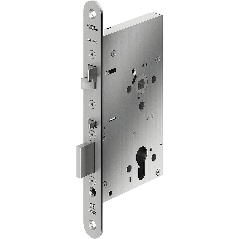Zweipunktverriegelung durch Federvorspannung nach Türschließung. Universal-Steuerfalle (24 mm Stulp-Varianten DIN-links und DIN-rechts verwendbar).