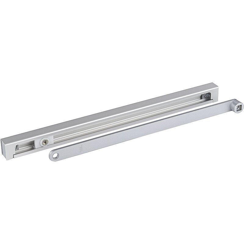 Bestehend aus Hebel, Gleitschiene, Gleitstück, Befestigungsstücke, Endkappen und Schrauben. Durch Langlöcher in den Befestigungsstücken ist es möglich, Abweichungen im Bohrbild auszugleichen und den Abstand zwischen Schließer und Gleischiene parallel zu halten.