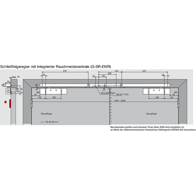 Ausführung:mit Schließfolgeregelung und elektromech. Feststellung im Standflügel und integrierter Rauchschaltzentrale
