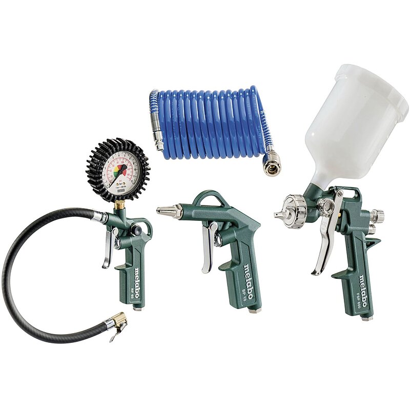 Lieferung inkl. Euro Stecknippel 1/4", Blaspistole, Reifenfüllmessgerät, Farbspritzpistole mit Fließbecher, PA-Spiralschlauch, im Karton.