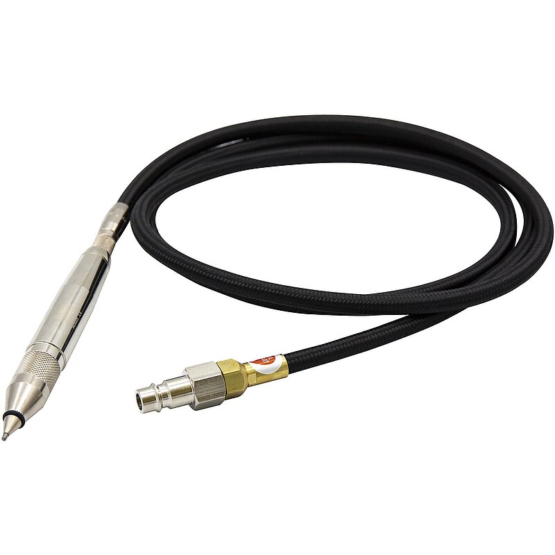 Bleistiftgroßer Gravierstift mit Drehschalter für Start-/Stopp. Zur Kennzeichnung, Gravierung und Reinigung von Werkstücken. Geeignet für Metalle, Kunststoffe, etc.