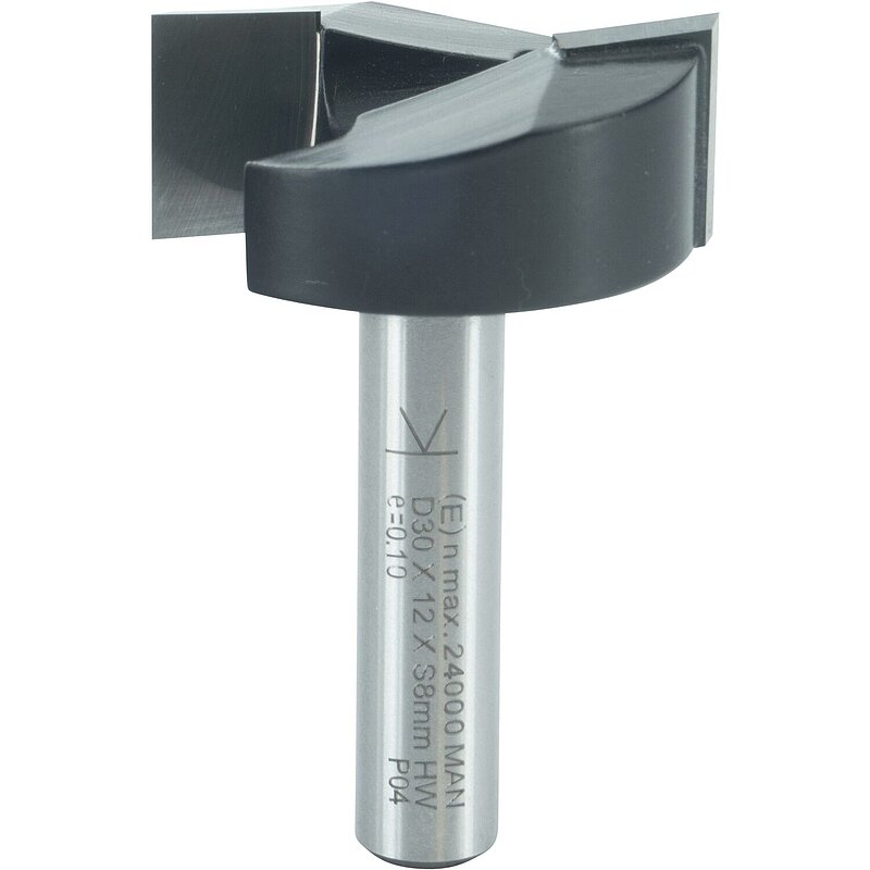 Planfräser, der umfang- und stirnschneidend ausgeführt ist. Er eignet sich besonders zum Einfräsen von großflächigen Scharnieren sowie zum Planfräsen von Holz- oder Kunststoffumleimern. Auch zum Bearbeiten von größeren ebenen Flächen geeignet.