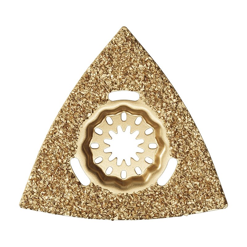 HM-bestückt, zum Grobschliff von Spachtelmasse, Fliesenkleber, Beton, Stein und Holz, Dreiecksform, Kantenlänge 80 mm, gelocht, zum Einsatz mit oder ohne Staubabsaugung geeignet.
