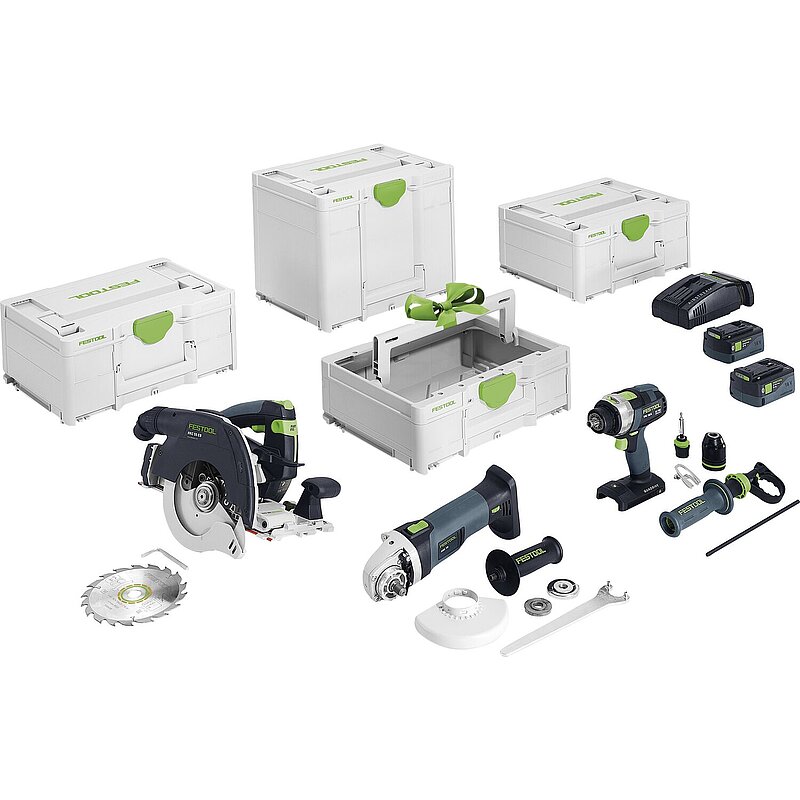 Lieferumfang:Akku-Handkreissäge HKC 55 5,0 EBI-Plus-SCA, Kreissägeblatt Wood Standard HW 160x1,8x20 W18, 2x Akkupack BP 18 Li 5,0 ASI, Schnellladegerät SCA 16, Systainer SYS3 M 337, Akku-Schlagbohrschrauber QUADRIVE TPC18/4 I-Basic, Bit PZ 2, Centrotec Magnet-Bithalter BH 60 CE, FastFix Schnellspannbohrfutter 13 mm, Gürtelclip, Werkzeugfutter WH-CE Centrotec, Zusatzhandgriff, Systainer SYS3 M 187,Akku-Winkelschleifer AGC 18-125 EB-Basic, Flansch BF-AGC 18, Schnellspannmutter QRN-AGC 18, Schutzhaube SH-AGC 18, Stirnlochschlüssel KF-AGC 18, Zusatzhandgriff Vibrastop, Systainer SYS3 M 187, Systainer SYS3 TB M 137.