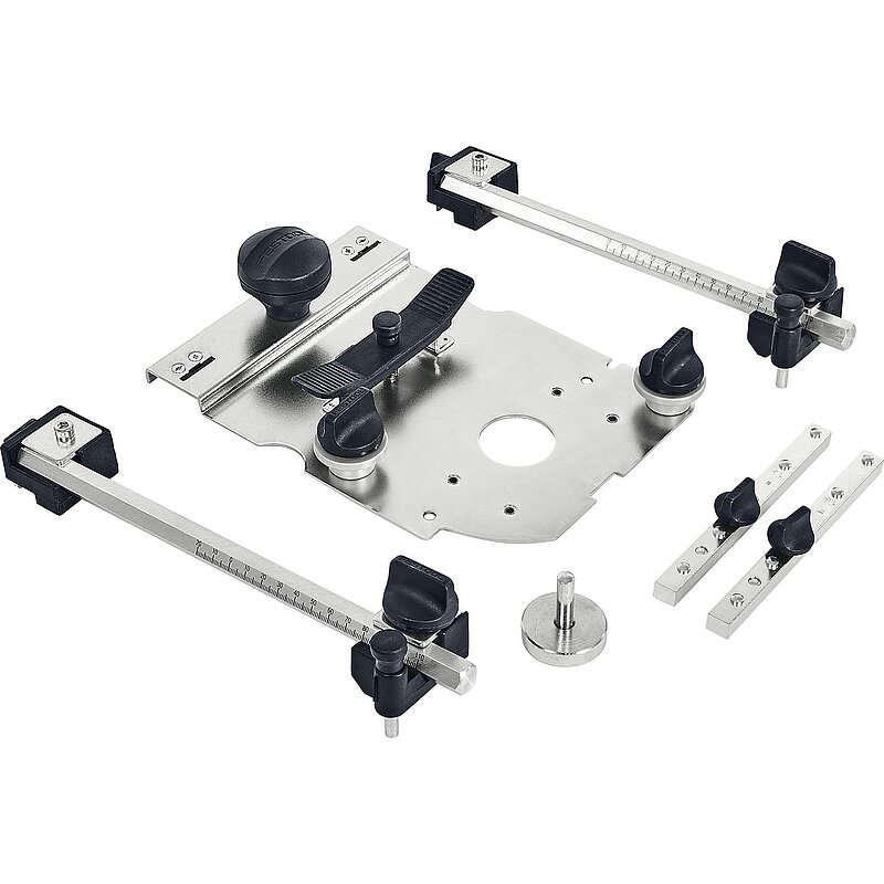 Lieferung inkl. Führungsplatte, Zentrierdorn, 2 x Seitenanschlag, 2 x Längenanschlag, im Karton.