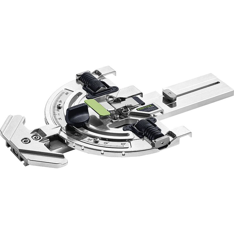Der Winkelanschlag für die Führungsschiene – für präzise und schnelle Winkelschnitte. Der Winkel kann wiederholgenau und in hoher Präzision eingestellt werden. Der Winkelanschlag bietet damit einen großen Einsatzbereich und volle Flexibilität. Dank Schnellspannhebel ist der Winkelanschlag intuitiv und im Handumdrehen an der Führungsschiene angebracht.