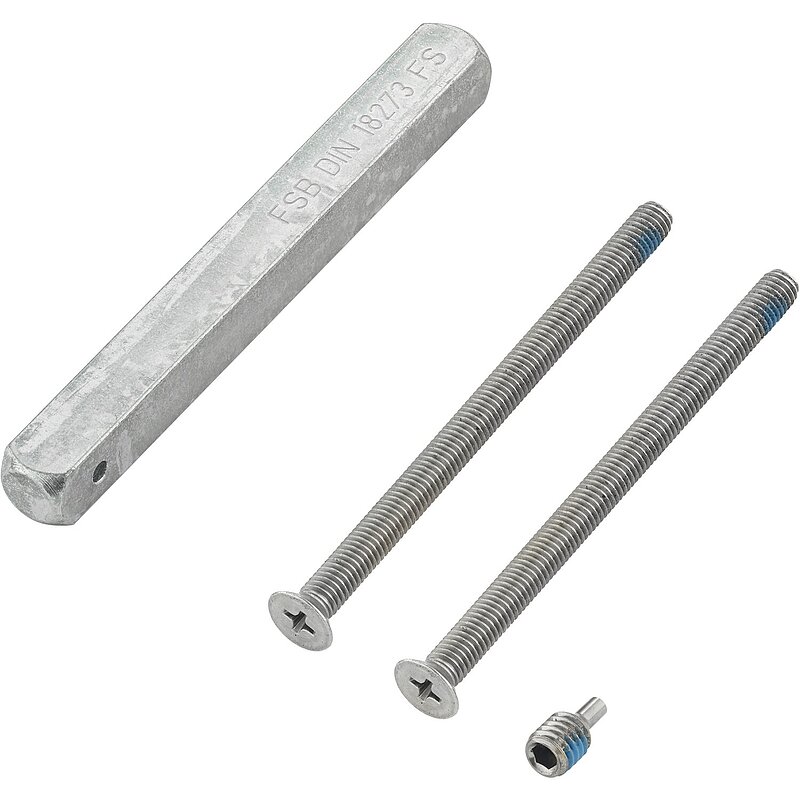 1 Vollstift 95 mm, 1 Gewindestift M6 x 12 mm, 2 Edelstahl Gewindeschrauben DIN 965 M5 x 85 mm