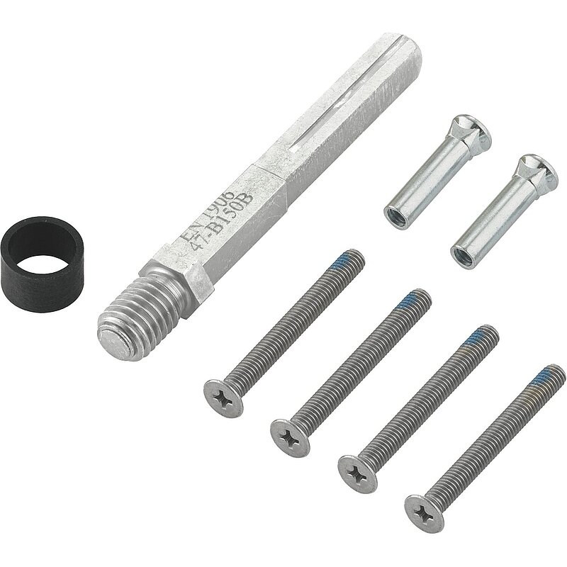 1 Vollstift mit Nut 135 mm, 1 Distanzhülse, 2 Stahlgewindehülsen M5 x 26 mm, 4 Edelstahl Gewindeschrauben DIN 965 M5 x 85 mm