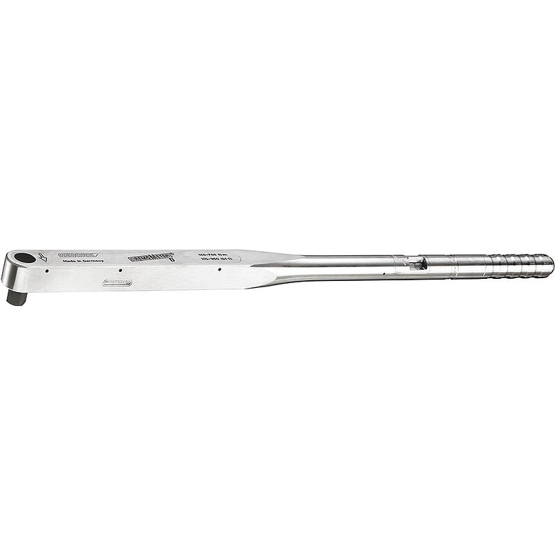 Drehmomentschlüssel mit Doppelvierkantantrieb für den kontrollierten Rechts-und Linksanzug, Antriebsvierkant mit Kugelsicherung, automatische Kurzwegauslösung mit fühlbarem und hörbarem Signal, Auslösegenauigkeit +/- 3 % Toleranz vom eingestelltem Skalenwert, Gehäuse aus Aluminium-Legierung, Doppelskala.