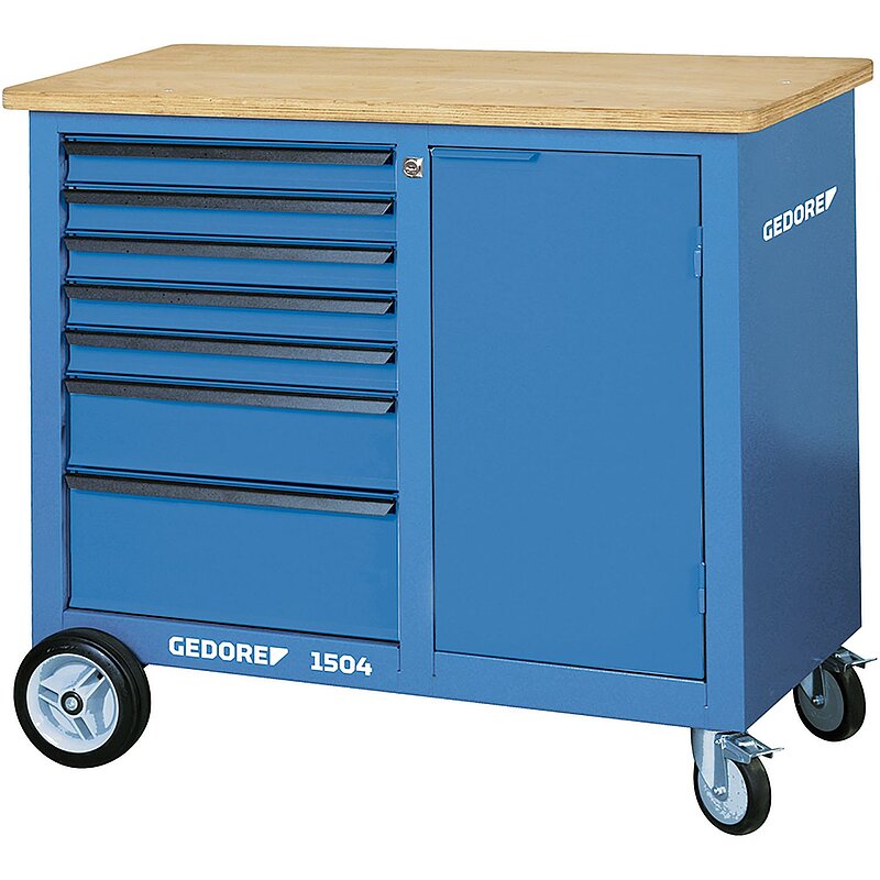 6 Schubladen mit Vollauszug. 30 mm starke Multiplex Buchen-Schichtholzplatte, Oberfläche durch Leinölfirnis zusätzlich geschützt. Großer Stauraum mit Fachboden und Tür. Sicherheit durch Fersenschutz für Personen. Stahlblech, korrosionsbeständig und kratzfest pulverbeschichtet. Zentralverriegelung mit Zylinderschloss. Breite Schubladen (B 480 x T 400 mm) mit Vollauszug, herausnehmbar. Sicherheitsverriegelung je Schublade, Einhandbedienung. Kugelgelagerte Führungsschienen. Tragkraft pro Schublade 40 kg, untere Schwerlastschublade 60 kg. Hochleistungs-Fahrwerk: Gesamttragkraft 700 kg, im mobilen Betrieb 500 kg. 2 rollengelagerte Hochleistungsräder (Bockrollen Ø 200 mm), 2 kugelgelagerte Leichtlaufräder (Lenkrollen Ø 125 mm), beide mit Totalfeststeller. Trapez-Achskonstruktion bewirkt auch bei maximaler Belastung: Leichtlauf, Wendigkeit und Spurtreue.