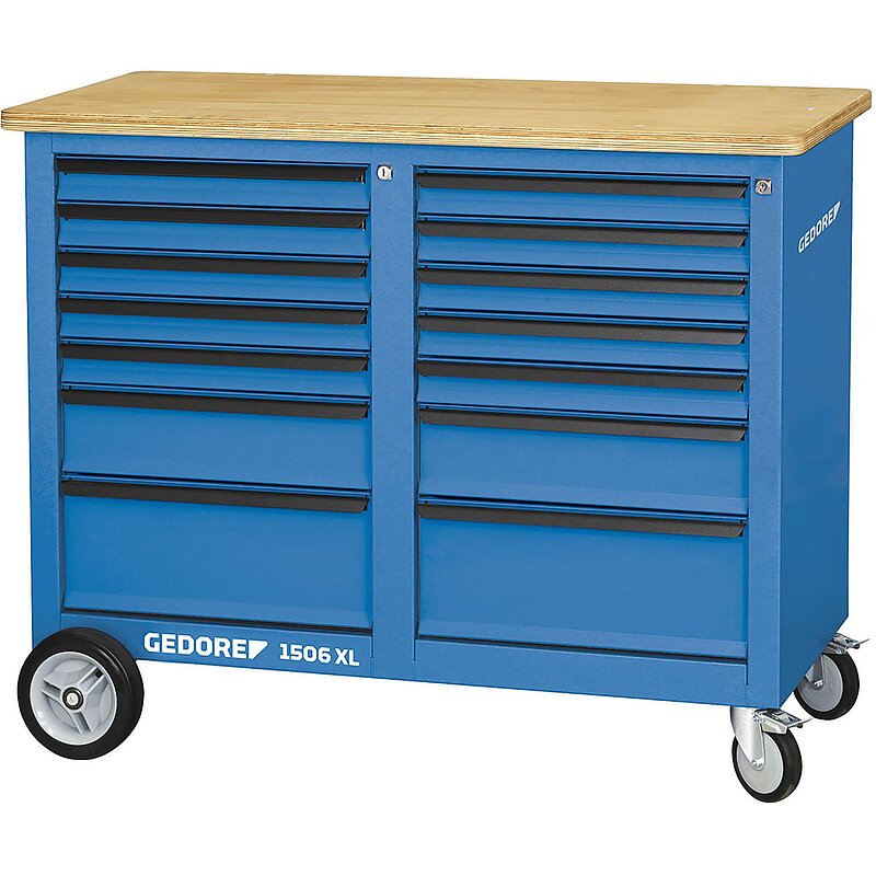 18 Schubladen mit Vollauszug. 30 mm starke Multiplex Buchen-Schichtholzplatte, Oberfläche durch Leinölfirnis zusätzlich geschützt. Mit zwei gleichen Schubladenblöcken. Sicherheit durch Fersenschutz für Personen. Stahlblech, korrosionsbeständig und kratzfest pulverbeschichtet. Zentralverriegelung mit Zylinderschloss je Schubladenblock. Breite Schubladen (B 480 x T 400 mm) mit Vollauszug, herausnehmbar. Sicherheitsverriegelung je Schublade, Einhandbedienung. Kugelgelagerte Führungsschienen. Tragkraft pro Schublade 40 kg, untere Schwerlastschubladen 60 kg. Gesamttragkraft 700 kg, im mobilen Betrieb 500 kg. 2 rollengelagerte Hochleistungsräder (Bockrollen Ø 200 mm), 2 kugelgelagerte Leichtlaufräder (Lenkrollen Ø 125 mm), beide mit Totalfeststeller. Trapez-Achskonstruktion bewirkt auch bei maximaler Belastung: Leichtlauf, Wendigkeit und Spurtreue.