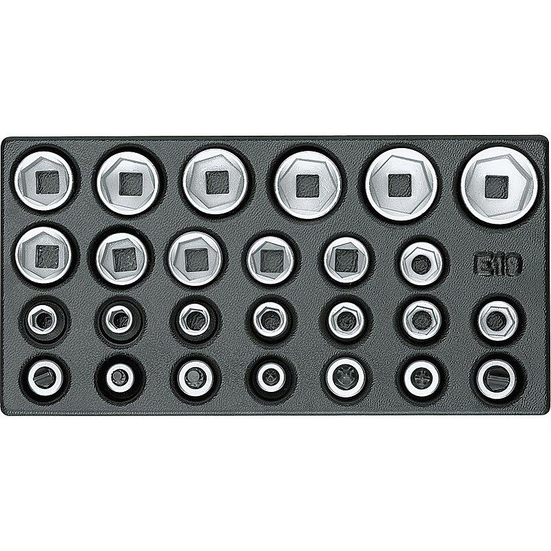 Inhalt: je 1 x Steckschlüsseleinsatz 1/2" 6-kant SW. 10, 11, 12, 13, 14, 15, 16, 17, 18, 19, 21, 22, 23, 24, 26, 27, 28, 30, 32 mm,