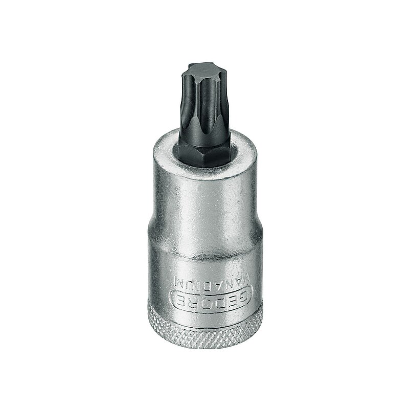 Für Innen-TORX-Schrauben. Mit eingepresstem Stift. Innenvierkantantrieb C 12,5 DIN 3120 - ISO 1174. Spitzen Gedore-Vanadium Sonderstahl brüniert, griffig gerändelt, verchromt, mit Kugelfangrille.