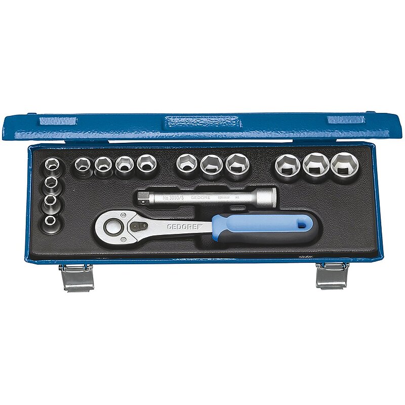 Mit geschmiedeten, vergüteten, handbetätigten 12-kant UD-Profil Steckschlüsseleinsätzen. Mit robuster Hebel-Umschaltknarre. In blauer Stahlblechkassette.
