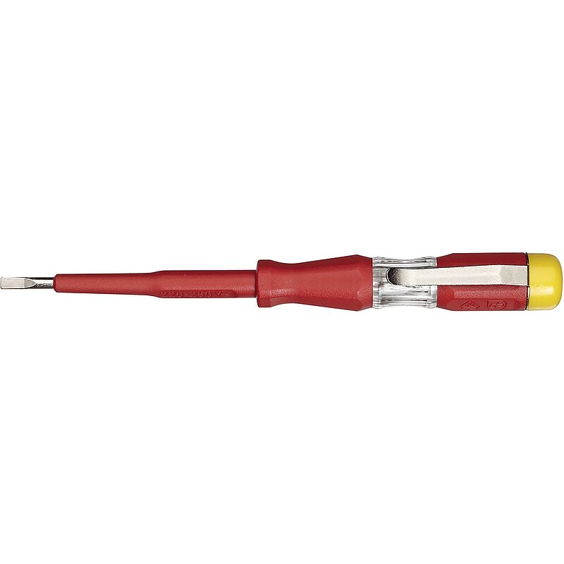 Für 220-250 Volt Wechselspannung, Klinge vernickelt, vollisoliert entsprechend DIN VDE 0680-6. Spannungsprüfer 60mm mit Metallclip und gelber Kappe.