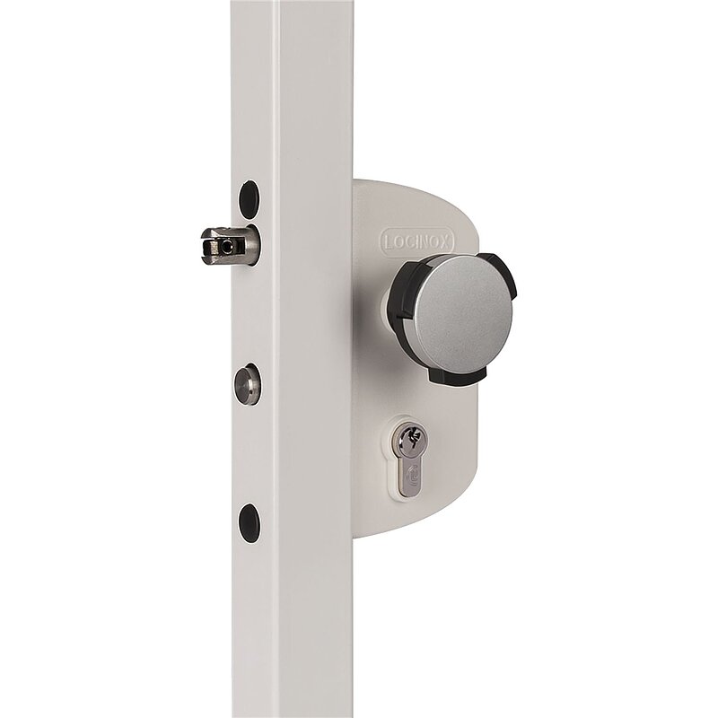 Kindersicheres Schloss mit Edelstahl-Mechanismus und Polyamid- Gehäuse. Dieses Schloss wurde gemäß den Anforderungen der Schwimmbadnorm NF P90-306 entwickelt. Der Kidloc-Sicherheitsknauf verwehrt kleinen Kindern den Zutritt zum Gelände. Der einzigartige Rollriegel vereinfacht die zügige Schließung des Tores. Für eine schnelle und höchst präzise Montage empfehlen wir die Bohrschablone Drill-Fix.