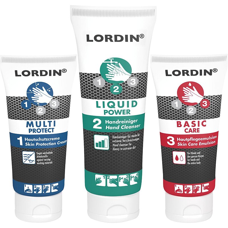 Lieferung inkl. Hautschutzcreme, Handwaschpaste, Hautpflegeemulsion.
