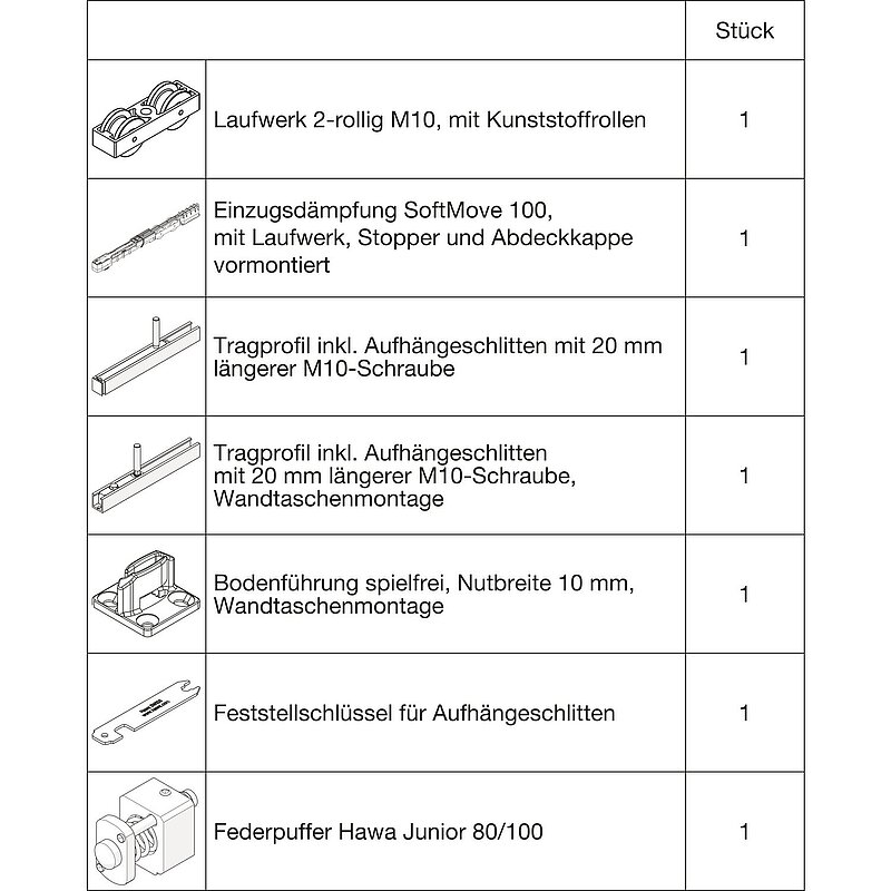 Beschlagset HAWA-Junior 100/B-Pocket SoftMove/Federpuffer + 20 mm