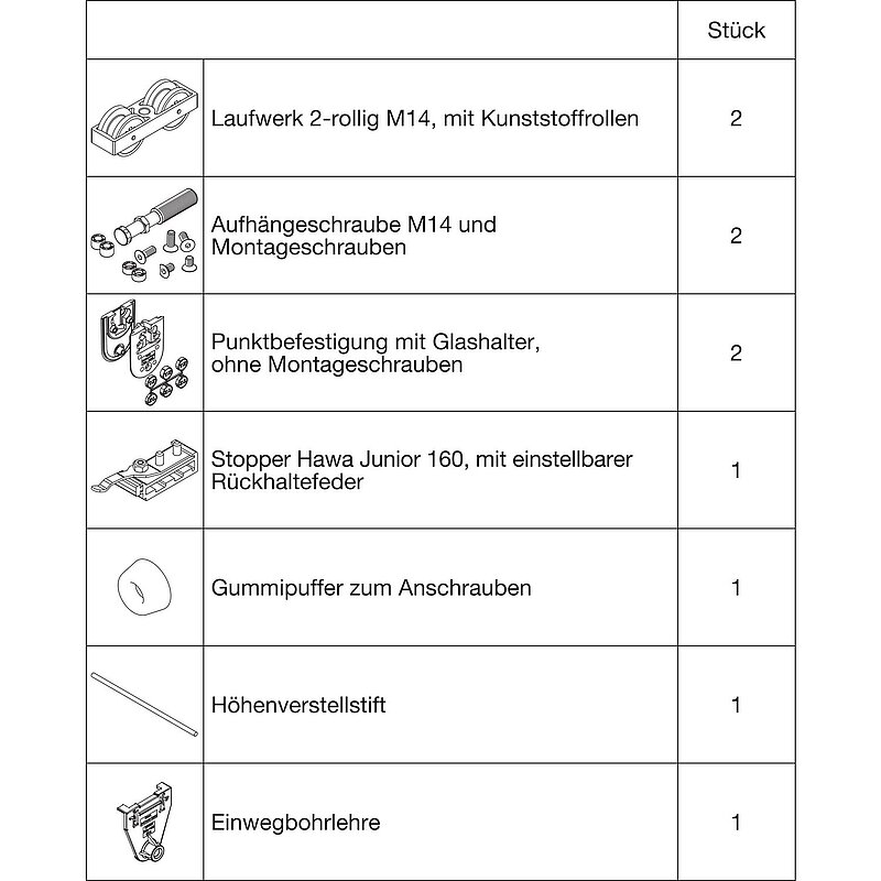 HAWA Junior 160/GP Beschlagset Glas ESG/VSG 8-12 mm ohne Laufschiene