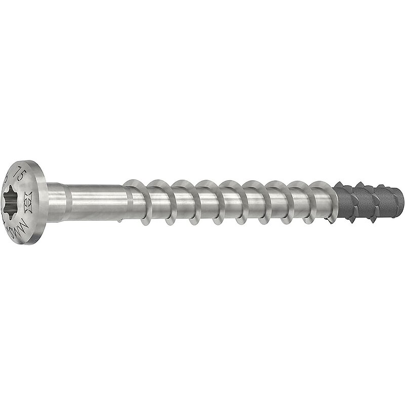 Der Schraubanker MULTI-MONTI®-plus A4 (MMS-plus A4) ist eine Weiterentwicklung der Betonschraube MULTI-MONTI® A4. Er wird ohne Dübel direkt in ein vorgebohrtes Loch geschraubt und ist sofort belastbar. Die verstärkte Verzahnung an der Schraubenspitze schneidet beim Einschrauben ein Innengewinde in den Baustoff. Dadurch entsteht ein Formschluss, über den schließlich die Verankerung erfolgt. Dies vereinfacht nicht nur den Montagevorgang, sondern gewährleistet dem Handwerker ein hohes Maß an Anwendungssicherheit. Die Betonschraube MULTI-MONTI®-plus A4 lässt sich randnah und ohne Drehmomentschlüssel verarbeiten und ist vollständig demontierbar.