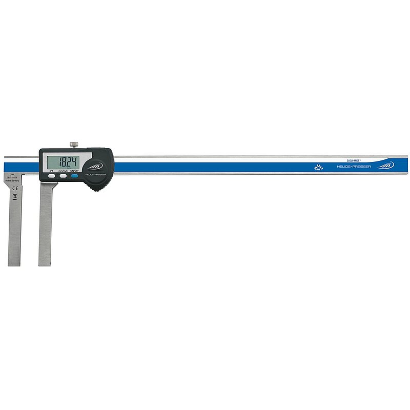 Digi-Met Universalmessschieber für Innen- und Außenmessungen, rostfreier Stahl, geeignet für alle Messeinsätze mit Gewinde M 2,5 mm, Messeinsätze müssen seperat bestellt werden, Werksnorm, LCD-Anzeige 8,5 bzw. 12,5 mm, Nullpunktsetzung an jeder Stelle, mm/inch-Umschaltung, mit Feststellschraube, Ein-/Ausschaltung, QuickStart Elektronik, QuickLock Funktion, Hold-Funktion, +/- Preset Funktion. Lieferung im Holzetui.