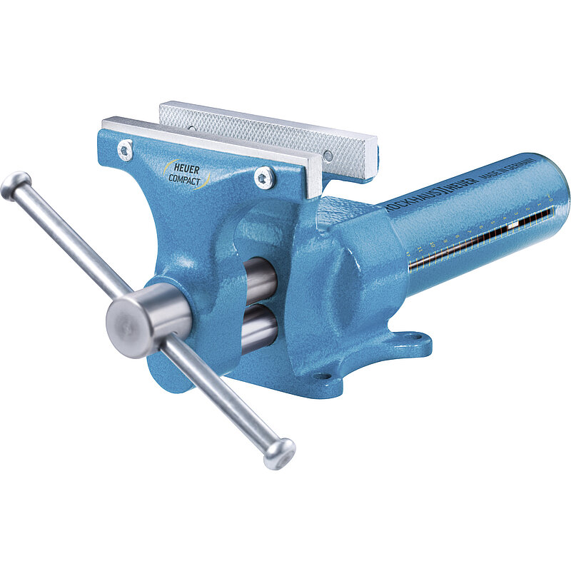 Ganz aus Stahl geschmiedet, garantiert unzerbrechlich. Hinterbacke mit Amboss, Schnellverstellung durch HEUER Quicklaunch in 3 Sekunden. Integrierte Öffnungsweitenanzeige. Dabei wird die Parallelität der Backen beim Spannen nicht vom Spiel der Spindel beeinflusst, das für eine optimal funktionierende Schnellverstellung benötigt wird. Druckfeder arretiert an der gewünschten Position und ist audiovisuell wahrnehmbar. Auswechselbare und wendbare Backen mit glatter und geriffelter Spannfläche, integrierte Rohrspannbacken.