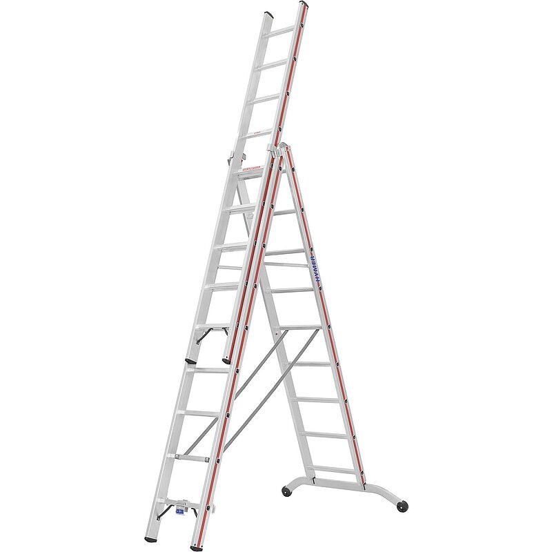 Kombinierbare Steh- und Schiebeleiter mit vielen verschiedenen Verwendungsmöglichkeiten. Leiterinnenbreite 300 mm (Oberteil), Sprossen aus stark profiliertem Strangpressprofil, daher erhöhte Rutschfestigkeit. Zwei starre Streben gegen unbeabsichtigtes Zusammenklappen ab Größe 3 x 7. Mit Holm verschraubte Leiterfüße im Anstellwinkel mit großer Auflagefläche und hoher Standfestigkeit. Gebogene Traverse mit 125 mm Bodenfreiraum, massive Stahlbeschläge. Ab Größe 3 x 10 mit Wandlaufrollen aus Kunststoff, stabile Aussteifungsstreben am Antritt. Klemmbeschlag zur Verwendung der Leiter in Treppenstellung bis Größe 3 x 9 serienmäßig vormontiert. Tragkraft 150 kg.