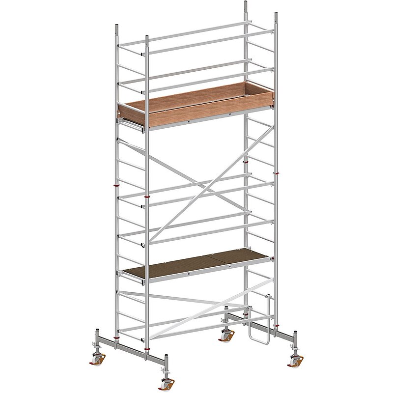 4 x Rahmenteil 8 Sprossen, 2 x Geländerteil, 2 x Bühne mit Durchstiegsklappe, 1 x Einstiegsbügel, 2 x Bordbrett Längsseite, 2 x Bordbrett Stirnseite, 4 x Bordbretthalter, 4 x Diagonale, 10 x Verstrebung, 2 x Traverse, 4 x Lenkrolle ø 200 mm mit Spindel, 4 x Sicherungsstecker