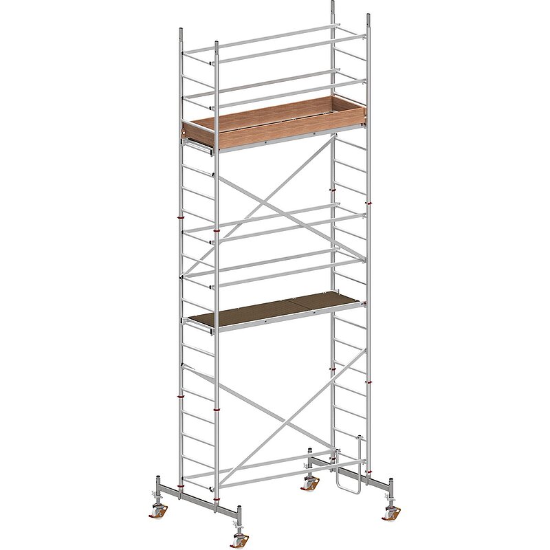 Rahmenteilbreite 0,72 m, Bühnenlänge 2,08 m, zulässige Belastung 260 kg (2,6 kN) verteilte Last, entspricht 200 kg/m² (2,0 kN/m²) gemäß Gerüstgruppe 3, DIN EN 1004. Sicherer Auf- und Abbau durch Verwendung einer Bühne je Etage. Gerüstteile können problemlos über die einzelnen Etagen weitergereicht werden.