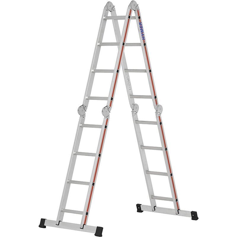 Universell einsetzbare Vielzweckleiter mit sechs Sicherheitsgelenken die in jeder Position automatisch einrasten, zur Verwendung als Steh- oder Anlegeleiter. Größe 4x3 inkl. Plattform zur Verwendung als Arbeitsbühne oder Treppenarbeitsbühne. Anlegeleiter, Arbeitsbühne und Treppenarbeitsbühne. Sprossen aus Walzprofil. Stabile Traverse für hohe Standsicherheit bei Lagerung und Transport. Geringer Platzbedarf bei Lagerung und Transport. Abmessung: 1,7 m x 0,9 m.Tragkraft 150 kg.